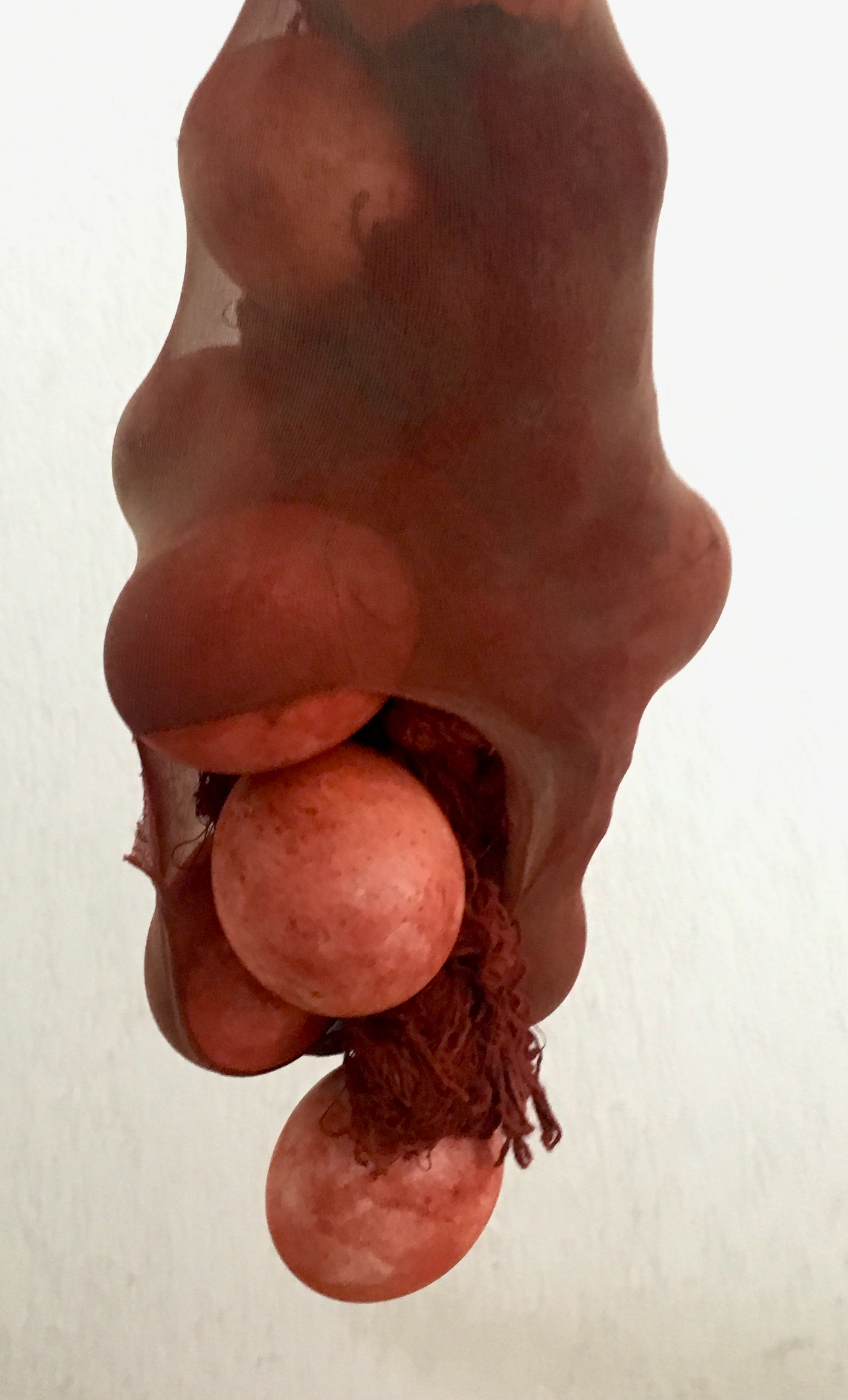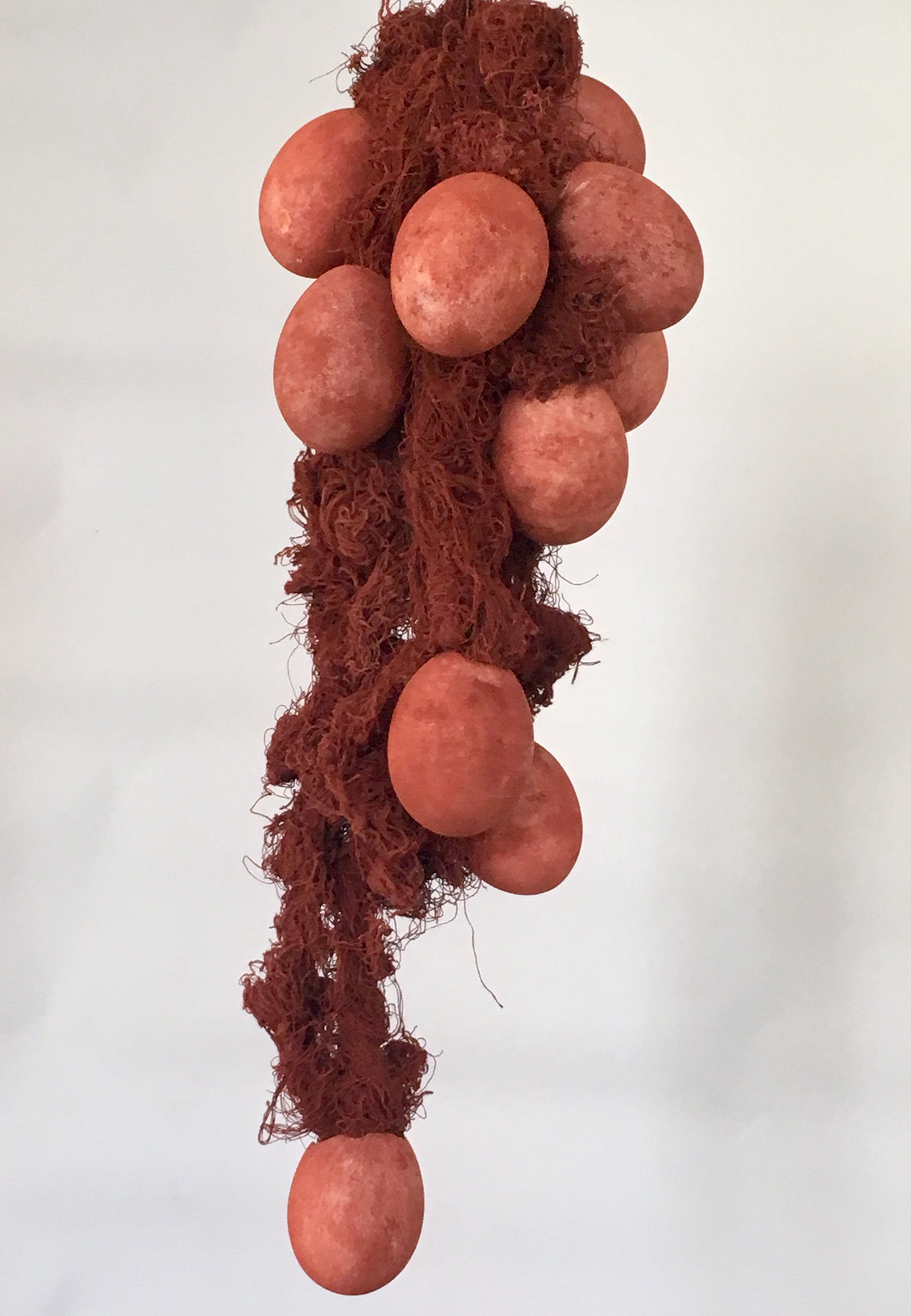 casca de ovo, meia de nylon, resíduos têxteis e pigmento vermelho